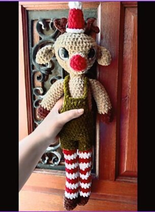 200 yards of size 6 yarn in primary colour (light brown) 80 yards of size 6 yarn in secondary and tertiary colours (red, green, white, dark brown) 30mm safety eyes 4mm hook Scissors Recycled yarn stuffing (polyfill will work) Embroidery thread for detailing if you want additional details. Darning needle, stitch marker, row counter (or a way to keep count of how many rounds you’ve done) Your Rudi will be about 50-60cm long depending on tension.