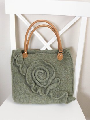 Beautiful felted bag pattern that is very easy to knit. Lightly ruffled rose adds interest to this lovely bag. This tote is easy to make and a great first felting project.
