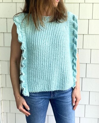 This is knit in a simple stitch pattern throughout the body of the sweater which is nice and quick for an advanced knitter and also a great next step for a beginner knitter. The ruffle is knit in a combination of a rib pattern and decorative stitch pattern to give a nice firm hold and ruffle shape.
