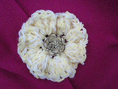 (Flower shown was made using 2 strands of worsted weight yarn, and a 10.5 mm crochet hook, and it measures approx. 5 inches in diameter.)