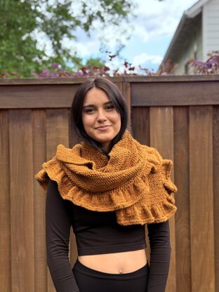 Wrap yourself in warmth and timeless style with this elegant knitted wrap, perfect for adding a touch of charm to any outfit. Designed in a classic seed stitch for beautiful texture and stretch, this adult one-size-fits-most accessory is both practical and flattering. Ruffles along three sides bring a soft, feminine flair, creating movement and a delicate finish. Whether draped over your shoulders for a chilly evening or styled as a statement layer, this wrap is as fun to knit as it is to wear.