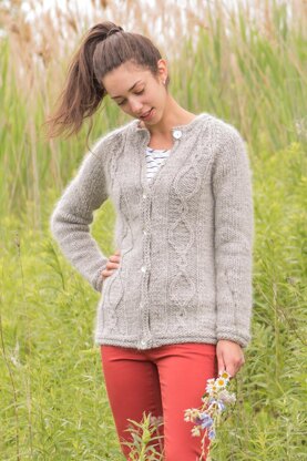 The Sleeves and Body of this cardigan are worked separately from the bottom up to the underarm where they are joined and worked together for the Yoke. The Yoke is decreased along 4 raglan lines from the underarm to the neck. Stitches for the collar and button bands are picked up and the underarm stitches are joined using a three-needle bind-off to finish.