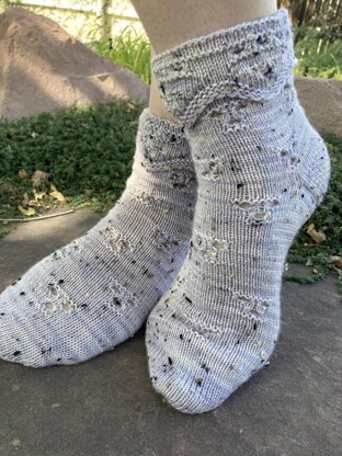 *A modern bobby sock for dancing the night away with a scalloped fold-over cuff and exaggerated cloverleaf lace. *