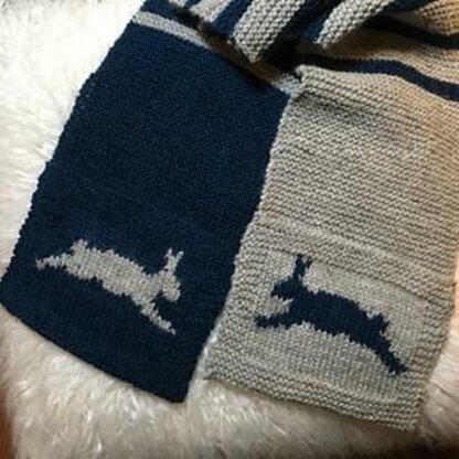 The wool is fluffy enough to fill the spaces nicely and durable to hold up through a cold winter. Use two colors of good contrast. The colorwork on the center of the scarf is striped garter stitch...easy peasy. Then on both ends are running rabbits in intarsia or duplicate stitch. The rabbits are worked from an easy to read chart with full directions. Appropriate for children through adults.