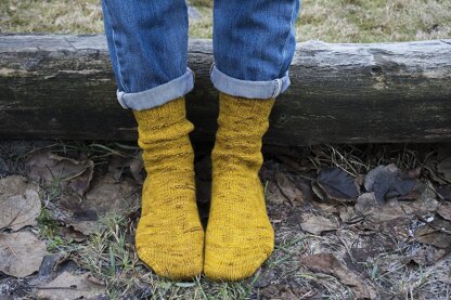 The Russet socks are worked in the round, from the cuff to the toe. The pattern includes a written description of the pattern and charts.