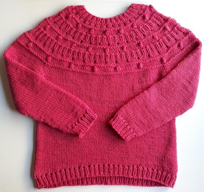 Knitted top down and in the round the rustia sweater is a quick knit, the circular yoke with it's popcorn, eyelet, rib detail give a lot of fun for the knitting process!