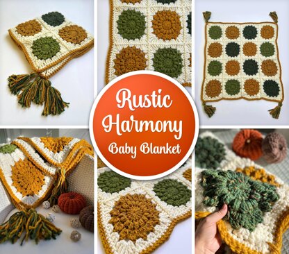 THE BLANKET SIZE: Rustic Harmony Chunky Baby Blanket. finished size: 44 x 44 inches or 112x112cm. PDF CROCHET PATTERN includes: - 13 page printable pdf - US terms - yarn amounts/quantities - yarn colours - stitch glossary - full colour chart of all squares and their positioning so you can make this EXACT colour copy! - full written instruction for the granny square used - full written instruction for joining - full written instruction for a border - full written instruction for tassels
