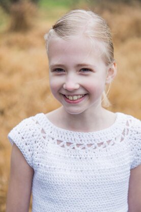 This shirt is written for girls sizes 6, 8, and 10. It features top-down construction, a collar with lace detailing, small cap sleeves, and a fitted bodice. It uses a soft Pima Cotton yarn (cascade ultra pima, 2-3 balls, depending on size) and a size G crochet hook. Step by step instructions are given, including pictures for trickier parts. Model is wearing size 8.