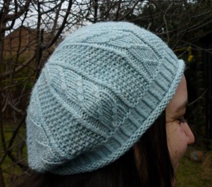 A slightly slouchy hat knit from the bottom up and features a rolled brim, twisted stitches (including twisted decreases) and seed stitch.