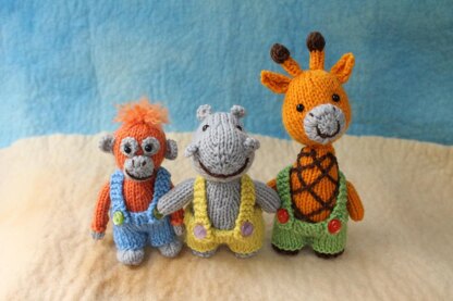 The pattern is knitted flat and sewn up at the end. No circular knitting is required. Finished size: Giraffe, 7in (18cm), Hippo, 5.25in (13cm), Orangutan 4.75in (12cm)YarnDK (8-ply) weight yarn• [A] 32g Grey• [B] 20g Yellow• [C] 10g Dark brown• [D] 15g Orange• [E] 10g Yellow Green• [F] 10g Soft Yellow• [G] 10g Aqua BlueDK,100% Acrylic, 100g per 280m