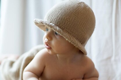 This made-for-warm-weather hat is knit in the round from the brim up. The brim goes all the way around to protect baby’s delicate skin from the sun and is encased in a knit rib. The pattern includes a traceable brim outline.