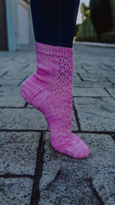 Inspired by blooming gardens and morning sunshine, the Sagebrush Socks are a simple, elegant pair of socks for the warmer months. They are knitted from the cuff down with a whimsical lace pattern panel on the front and a short row heel.