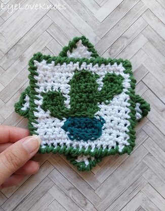 How to crochet a modern cactus coaster featuring surface slip stitches and reverse single crochet edging. You'll need 30 yards total per coaster of worsted weight cotton yarn. I used WeCrochet Dishie in White, Jalapeno and Kenai, but Lily Sugar n Cream is a good alternative. If you are only making a coaster that will house a cold or hot beverage, you can use acrylic as an alternative with an I9/5.5mm hook - just do not put anything fresh from the oven on the acrylic coaster, or you will melt the fibers and risk burning yourself. I worked up one coaster in just about an hour.
