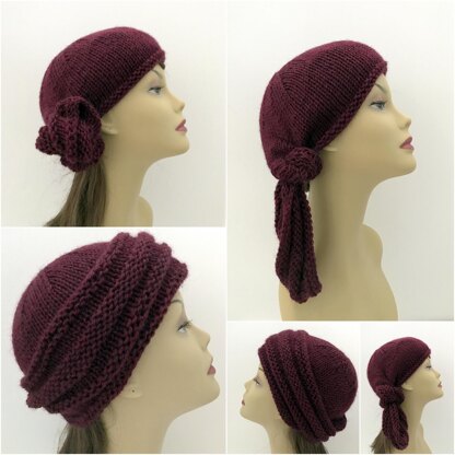 The Sahara is a perfect head covering for all seasons.   Knit it in a cotton acrylic or cotton linen blend for warm months to wick moisture away.  Knit using wool blends for colder months to provide warm.