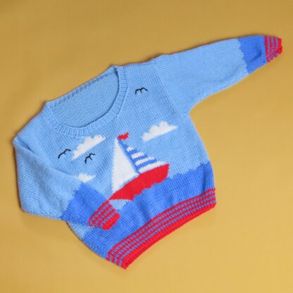 This children's jumper features a cheerful red boat sailing away on the waves... The jumper is worked flat from the bottom up, with the main image worked from colour charts using the intarsia method, with seagulls embroidered on at the end. The stripey rib at the hem and cuffs adds a splash of colour and an extra nautical detail. Techniques include knit and purl stitches, intarsia colour work from charts, increases and decreases and picking up stitches.