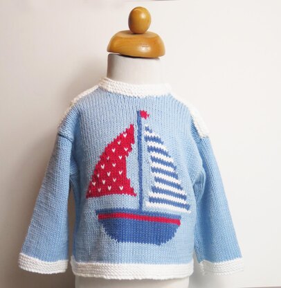 Sailing Boat Intarsia Sweater Babies, Knitting Pattern with easy button neckline for baby and toddler to 3 years, seaside, beach colour knit Intarsia knit sailing boat picture knitting pattern for babies and toddlers to 3 years. Worked from a chart this written picture knitting pattern is for a sweater to fit ages 0 - 3 years with long sleeves and a button neckline for easy fit over child's head. Great as a beach cover up or for chilly summer days at the beach. The sweater is worked in Debbie Bliss Eco Baby yarn.