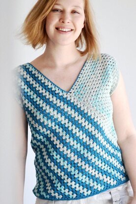 Sailmaker top is easy and quick to make and its unusual construction will keep you interested to the last stitch! The diagonal construction combined with alternating solid and variegated yarns brings out the best of both yarn colors, creating a watercolor-like effect.