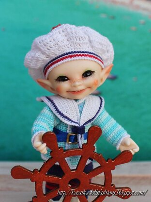 “Sailor Outfit” is a doll clothes pattern to fit BJD RealPuki-type dolls. The 10-page pattern contains instructions to make a pants, beret, jacket and sailor collar. Instructions are written out as row-by-row description with detailed explanations and photos.