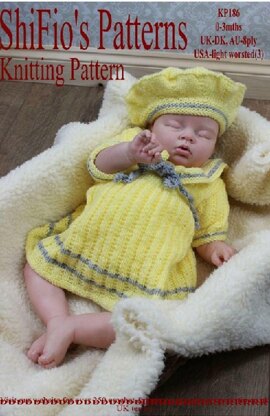 Sizes 1: 0-3 months **Skill Level:**2 - Fairly easy **Materials:**3 med buttons, 3 press studs/ poppers, 18” (½ mtr) of ¼ ”(0.25cm) navy ribbon for bow **UK Materials:**Knitting needles 3.75 mm, 200g main, 25g contrast double knitting yarn **USA Materials:**Knitting needles size 5, 7oz main, ¾ oz contrast light worsted yarn(3)