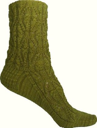 Sake combines simple cables narrowing into hourglass-shaped tracery patterns. The sock is knit from the top down with a slipped stitch heel. Sake is lovely in a variegated yarn, but if you want to highlight the stitch pattern, please consider using a solid, semi-solid or light colored variegated yarn.