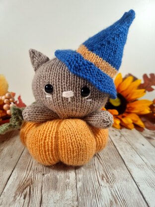 This adorable little feline rests atop a plump pumpkin and has a tiny blue wizard hat perched on his head, Salem captures the whimsical charm of the season.