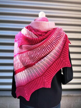 The shawl is rich in variety because of its multiple patterns consisting not only of purl andknit stitches but of slipped stitches and two-coloured Brioche stitches, too. This is why it is especially suited for advanced knitters.