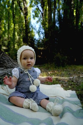 A lace patterned pixie hat with matching bootees. Finished off with icord ties and pompoms.