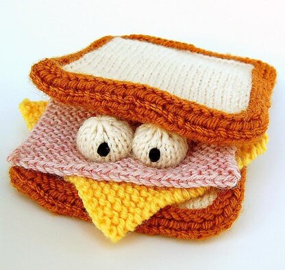 The ham, cheese, and bread slices are knit flat, with some creative joining techniques for the crust. The eyeballs are knit in the round, and the whole thing is put together with just a few sewn stitches. Photos, stitch descriptions, and helpful links are included.
