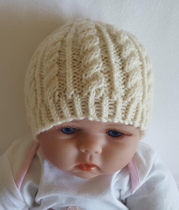 This baby’s Beanie is worked in a four row cable pattern and the brim is worked in rib.