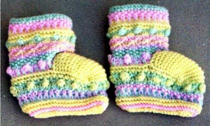 A good sampling of different stitches! Good way to try different stitches, and the rows are short, so it wont take you long at all to knit. These are so precious in pastels, but any colors will work too. Booty is started at top, and ends at bottom of foot. Fairly easy to do. You can change colors for the pattern, or use all one color. Either way, these are fun to knit! Uses sport weight yarns, knitting needles US # 4. Fits up to about 6 months.