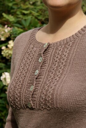 Samsara is a light-weight henley sweater with cable and twisted stitches details on the fronts and the just above wrist-length sleeves. The body of this sweater is worked in pieces from the bottom up. The shoulders are joined using three-needle bind off. Sleeves are worked in the round from the cuff up. After seaming front and back together the sleeves are set in. After finishing the neckline, stitches are picked up at the front split to knit the button band and the buttonhole band.