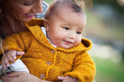 This basic drop sleeve hoodie, while very simple to knit up, will look anything but basic on your little one. The tight gauge and fiber content make it wonderfully durable and warm, so it will hold up to all the antics it's sure to endure. This sweater just seemed to name itself when it was finished. The floppy hood, the orangey yellow yarn, the general littleness of my son when he fit into it, and how much of a good buddy he already is to me, reminded me of one of my favorite hobbits.
