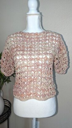 This pink with cream variegated handmade crochet mesh top would likely feature a blend of soft pink and cream-colored yarns, creating a subtle gradient effect. The crochet mesh design would give it an airy, textured look, perfect for warm weather or layering over a camisole. It would have a delicate, handmade feel, with intricate stitching adding to its charm. Using only double crochet and chain stitches. This handmade crochet mesh top achieves a beautifully simple yet intricate design. The double crochet stitches provide structure and texture, while the chain stitches create the open, airy mesh pattern.
