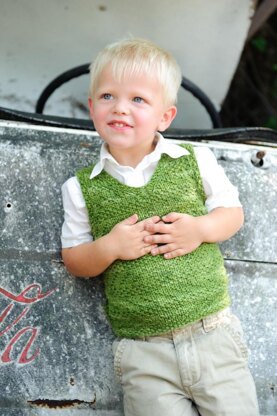 A classically shaped v-neck vest for little men, this sweater features a textured stripe design throughout. It's worked from the bottom up in the round, and back and forth once shaping for armholes begins. Stitch patterns keep it interesting to knit, and it’s worked seamlessly!
