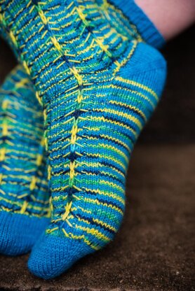 Designed to show off the craziest of variegated skeins this sock makes use of a stitch I developed by combining slipped stitches with a lifted bar and named the Sandpiper Stitch.