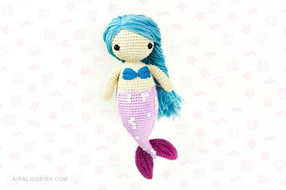 Materials  - DMC Natura Just Cotton yarn (50g/155 m) in: Yarn A Rose Soraya N32 (pale pink) Yarn B Gardenia N36 (skin tone) Yarn C Amaranto N33 (mauve) Yarn D Aguamarina N35 (pale turquoise) Yarn E Turquoise N49 (turquoise) Yarn F Prussian N64 (blue) - 2.5 mm (B-1) hook - 2 safety eyes (approx 8 mm in diameter) - Sequins - Tapestry needle - Toy stuffing - Adhesive tape - Sewing needle, thread and pins I’d love to see your mermaid, share a photo on Instagram using the tag #airalidesign @airali_gray
