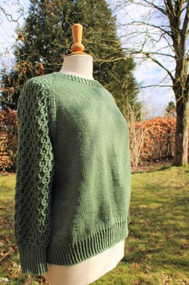 Sandur is a classic raglan pullover with a nice lace pattern on the sleeves - knitted from the bottom edge and up. The pullover has a raglan yoke and sleeve construction with long sleeves. The pattern is made for at yarn with a gauge of 18 stitches per 10 centimeters (stockinette stitch) i.e. a yardage of approximately 80 meters per 50 grams.