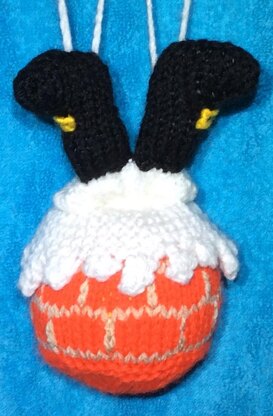 This knitting pattern is for a festive drawstring gift bag in the shape of a chimney with Santa's boots at the top.