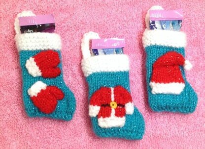This knitting pattern is for three christmas stocking decorations with Santa's hat, mittens and jacket.