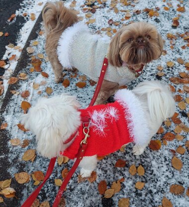 DK Santa small dog coat knitting pattern using KIng Cole Glitz Cherry and King Cole Tinsel Chunky White