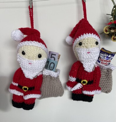 This gorgeous Santa with his sack ready to fill with sweets or money is ready to hang on the tree and is a super quick pattern to knit or crochet.