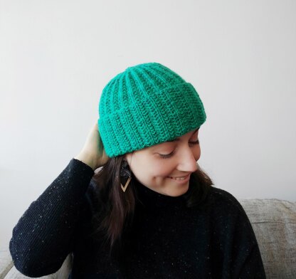 It is a long beanie that can be worn in two ways: slouchy or folded, creating a wide brim to better cover the ears.