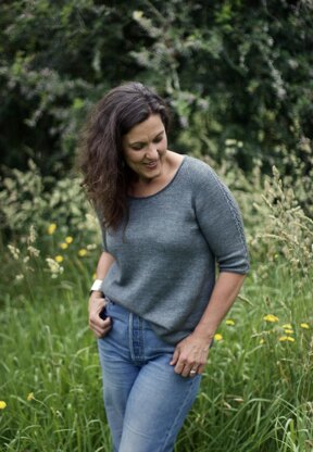 Knitted seamlessly from the top and including lovely shaping and thoughtful details, Saoirse (seer-sha) is lighthearted and lightweight with a cheeky swing. From her sweet scooped neckline with its rolled edge to the pretty lace panel down each raglan sleeve and easy-fit body, she’s perfect for warm days.