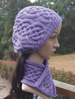 This set includes a cabled buttoned Neck Scarf and matching cabled slouchy Beanie.