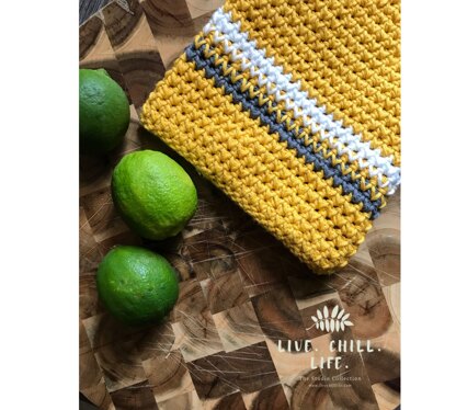 This cheerful and stylish woven look crochet towel will add pizzazz to any home decor or table. Option to create dual end stripes for a placemat or single side stripe for a towel are included. The stitch is flexible yet substantial.