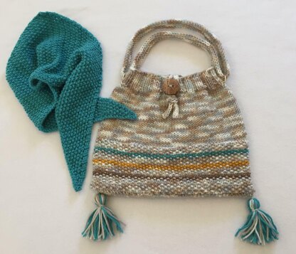 A great "off we go" shopping on Saturday set! Or off to lunch with a special friend, and don't forget to make her a matching set like this too. Easy knitting here, use one of the stripe colors in bag to make the matching scarf. The scarf can be worn around the head, around the neck, or around shoulders in cool air conditioned buildings. Makes a nice accent scarf to wear to work to "zip up" any wardrobe with color!