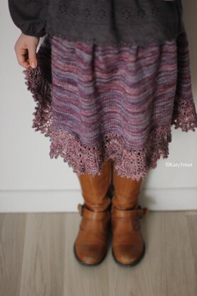 Perfect for all seasons wear this skirt is worked in the round and top down. Beautiful lace border with a picot edging gives a little bit of flirt to stockinette stitch. Feel free to use any combination of your favorite yarns for a playful effect.