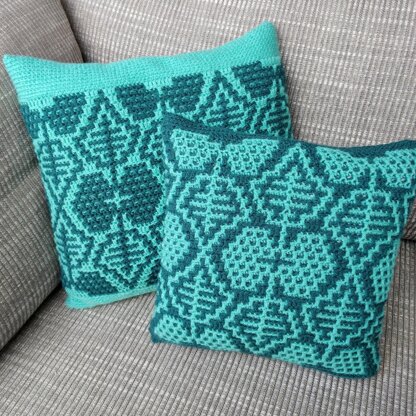 This stylish cushion pattern uses simple overlay mosaic crochet techniques, designed to mimic autumn leaves. It is worked in the round, so no ends to take care of! This cushion can be made as a small 12” x 12” version or larger 15” x 15” version. The pattern includes written instructions, charts and some helpful hints and tips to make your project easier. You will also get instructions on stitch formation and placement and how to read the chart. The instructions describe how to make a fixed cover (no fasteners), but a zipper, snap fastenings or any other method can be used if the cushion pad needs to be removed in future.