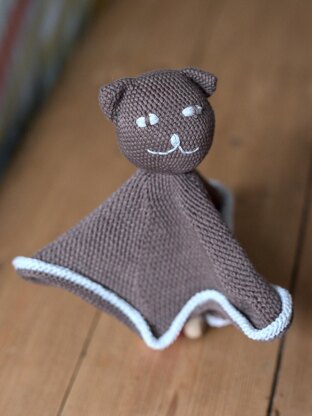 Animal loveys or security blankets are doubly functional, as a comforting blanket and plaything. This cat works up quickly and, owing to the slip stitch fabric, has an interesting texture, is soft and pliable. The bottom edge features a crocheted-on cord, easy to grasp even for tiny fingers.