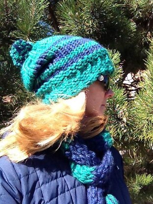 This hat is loom knit on the green Knifty Knitter 36-peg round loom which fits an adult small-medium. You can easily knit this on the yellow Knifty Knitter 41-peg round loom to fit an adult large-extra large.